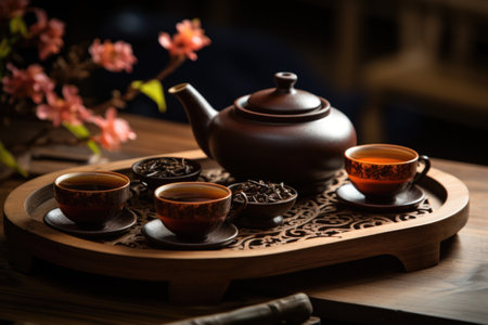 tea ceremony with teapot and teacup on wooden tray