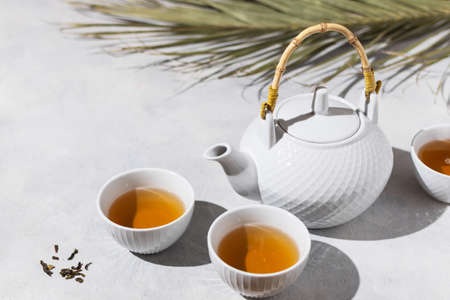 beautiful white blue porcelain teapot and cups with green tea on a wooden table