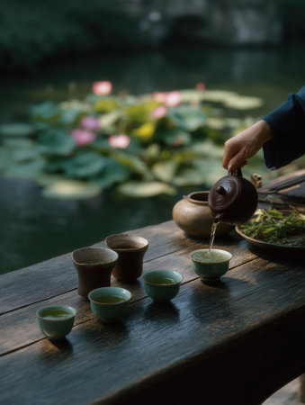 Hand pouring hot tea from a stoneware teapot into small ceramic cups on a rustic wooden table, conducting a traditional tea ceremony by a peaceful pond with blooming lotus flowers