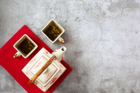 Asian tea concept, two cups of tea and a teapot. Top view.