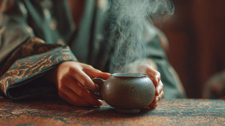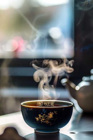 A serene scene featuring a cup of freshly brewed herbal tea, steaming gently in a delicate blue ceramic bowl adorned with a gold floral design. The setting evokes a feeling of relaxation and warmth.