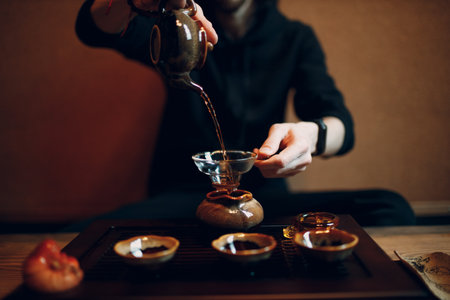 The tea ceremony. The hands of man pouring tea in a tea bowl. Close-up.