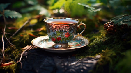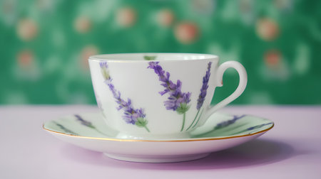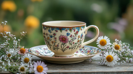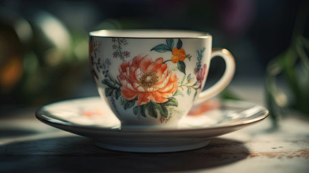 A beautifully decorated teacup and saucer on a wooden table in a cozy setting
