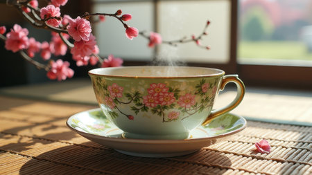 Steaming floral teacup with cherry blossoms by sunny window. That the image is generated using AI.