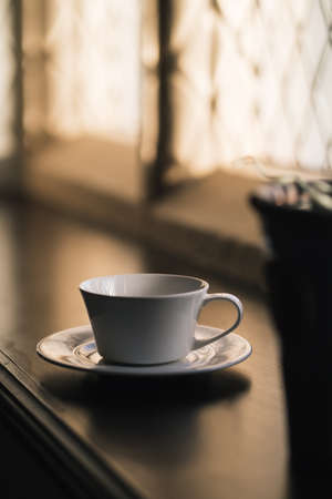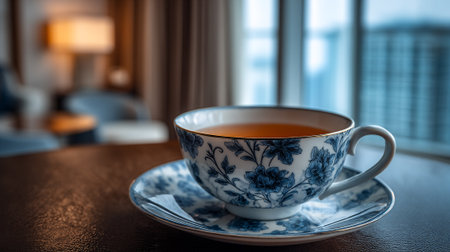 A delicate tea cup and saucer on a wooden table in a cozy room