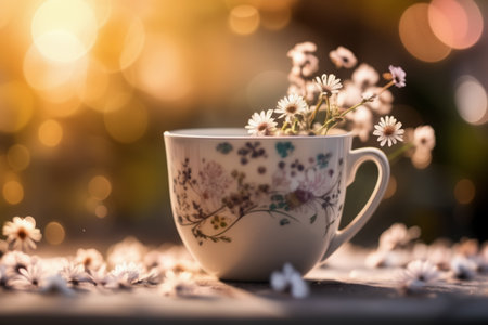 Elegant floral tea cup with sunlight and cherry blossoms by a window. That the image is generated using AI.