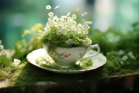 A delicate tea cup and saucer sit amidst vibrant greenery and blooming white flowers, creating a serene and inviting scene.