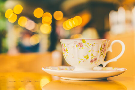 A delicate floral teacup filled with tea on a saucer in a cozy cafe setting