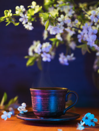Colorful bright spring still life, a cup of espresso coffee on a wooden table, blooming branches of white cherry trees. Color light