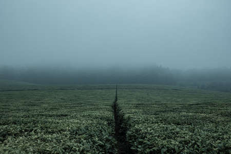 Blur background of fog enveloped tea plantation hills at dawn. Tea field landscape with mountain photography. Serenity and nature concept. Design for calming wall art, environmental poster. Spate.