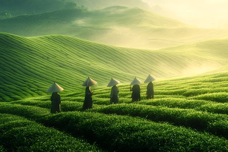 Five tea farmers wearing traditional conical hats are walking through a vibrant green tea plantation at sunrise, creating a serene and picturesque scene of rural life