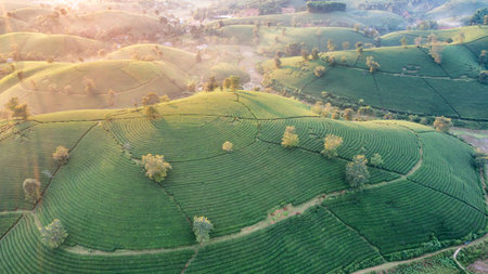 Aerail view Tea farm with sea of mist, green tree, blue mountain