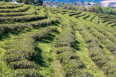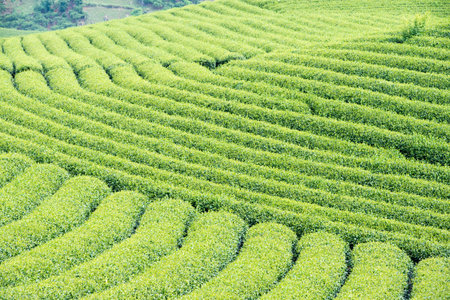Green tea plantation curve on hill and mountains valley in Chiang Rai province in summer season, Thailand, Asia