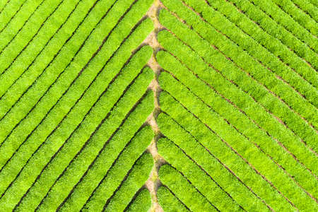 Close up of beautiful green tea crop garden rows scene, design concept for the fresh natural tea product.
