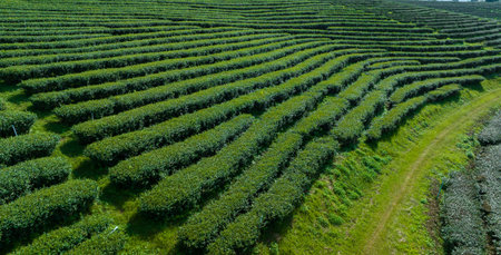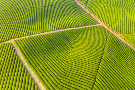 agricultural area of green tea plantation on the mountain north of chiang rai thailand aerial view photography from drone