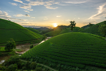 Sunset view of tea plantation landscape at Chiang rai, Thailand.