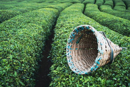 side view closeup of traditional harvesting wicker conical basket on rows of Turkish black tea plantations in Cayeli area Rize province