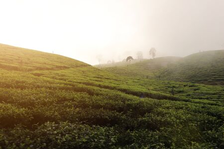 Amazing landscape view of tea plantation in sunset, sunrise time. Nature background with blue sky and foggy.