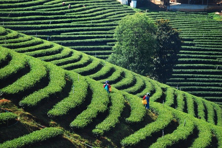 mountaineers harvest green tea leaf from plant rows, Doi Angkhang, Fang, Chiangmai, Thailand
