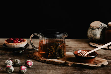 The vintage composition of kitchen interior with a pot of tea, honey and cake. Stylish winter and autumn concept of tea time and breakfast. Black background.