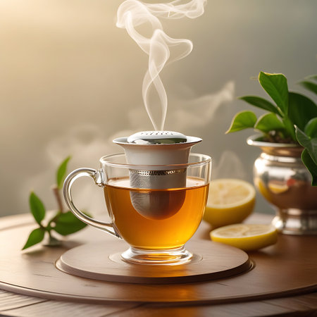 A clear glass cup filled with amber-colored hot tea is presented with a silver tea infuser submerged within. Steam rises from the tea. Two slices of lemon are placed beside the cup, and a small green plant in a silver pot is visible in the background. The scene is set on a round wooden tray with a subtle carved pattern. Soft, warm light illuminates the composition.