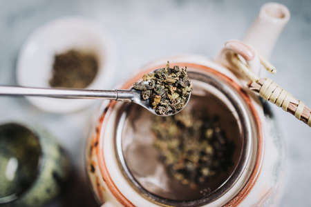 Close up of man hands pouring tea leaves into the teapot