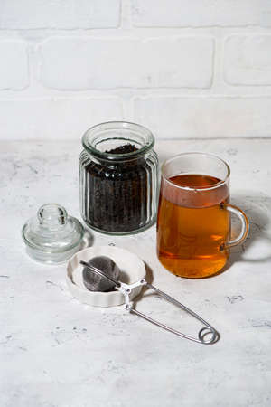 Clear glass cup of hot ceylon black tea in a mug with silver stainless steel tea strainer next to it on a white table