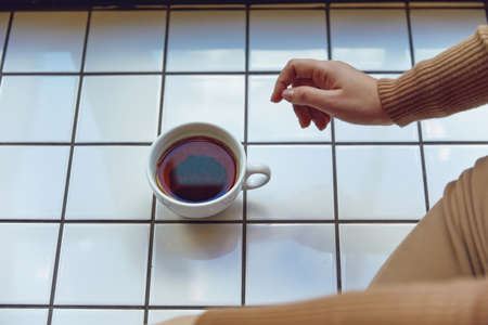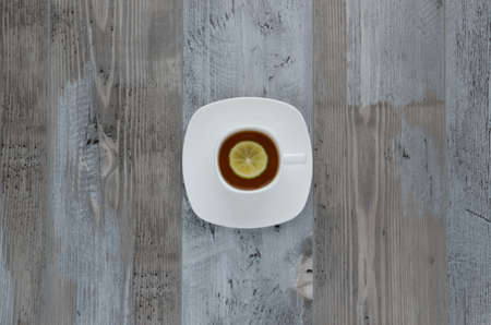Hot tea cup on the black wooden table, flesh morning drinking, bird eye view shot