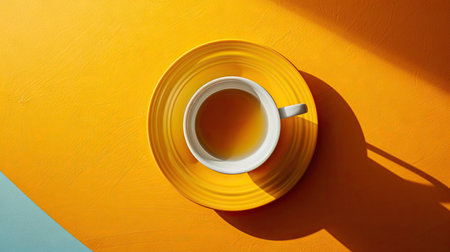 A cup of black tea in a ceramic yellow cup with dry tea scattered on a yellow background. Copy space. Top view.