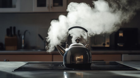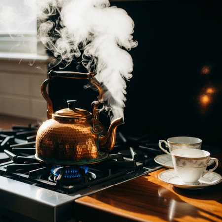 A serene image capturing steam rising from a kettle on a warm kitchen surface, evoking feelings of comfort and tranquility in a cozy environment.