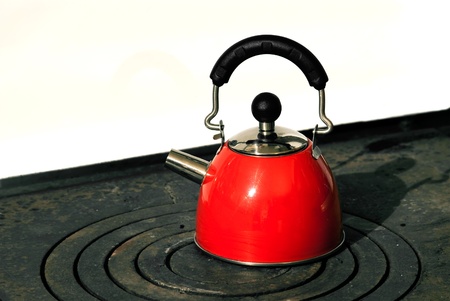 Kettle in kitchen. Simple kitchen in small apartment. old kitchen items. Old fashioned interior.
