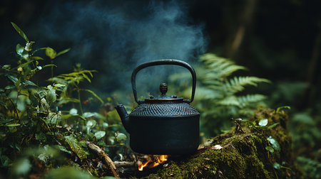 A dark, textured cast iron teapot sits over a small campfire, emitting a plume of steam. The teapot is surrounded by lush green foliage, moss-covered logs, and ferns, creating a rustic and atmospheric scene in a forest setting. The fire below glows warmly, contrasting with the cool tones of the surrounding nature.