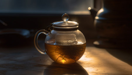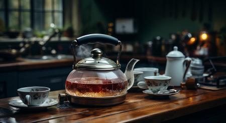 Hot steam rises from old fashioned teapot handle generated by artificial intelligence