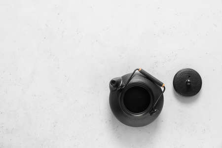 A black tea kettle sits on a surface, releasing thin steam, suggesting hot water is ready for brewing tea in a calm atmosphere.