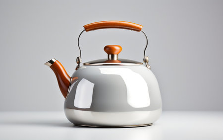 A beautiful stainless steel kettle sits on a wooden countertop, reflecting light and bringing a cozy and elegant touch to a modern kitchen interior.