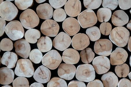 A large pile of wood logs, with some of them being cut into smaller pieces. The logs are arranged in a way that creates a sense of depth and texture, with some of them overlapping each other