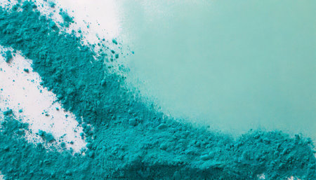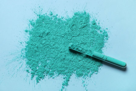 Tube with turquoise powder pigment on blue background