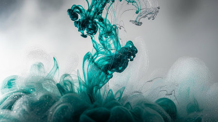 captures a dynamic explosion of teal ink and silver particles within water. The ink forms swirling, cloudy masses with delicate tendrils, while the silver particles add a sparkling, ethereal The composition is abstract and organic, evoking a sense of cosmic dust or underwater phenomena. The soft lighting and diffused edges contribute to a dreamy and artistic feel.