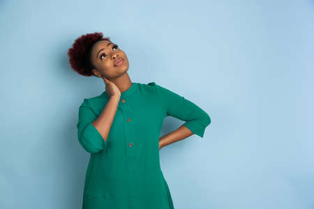 Thoughtful, dreamful. African-american young womans portrait isolated on blue studio background. Beautiful female model. Concept of human emotions, facial expression, sales, ad. Copyspace.