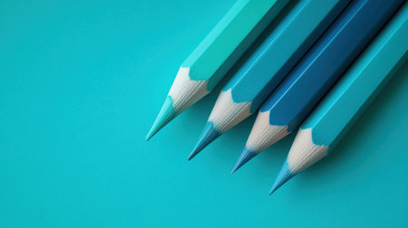 Five pencils arranged in a gradient of teal and turquoise shades sit against a soft background, showcasing their sharp tips and a beautiful blend of colors under natural light.