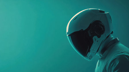 This striking image features a detailed silhouette of an astronaut helmet against a vibrant teal background, emphasizing themes of technology and exploration.