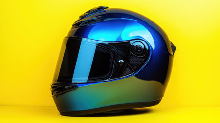 This image features a glossy blue motorcycle helmet set against a vibrant yellow background, emphasizing safety and style in cycling and riding sports.