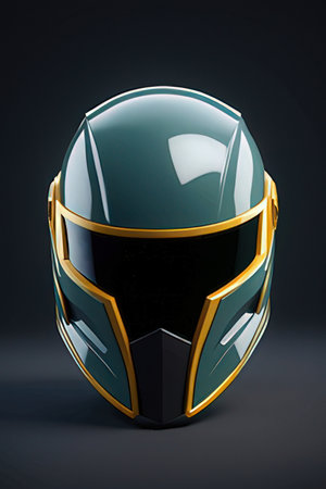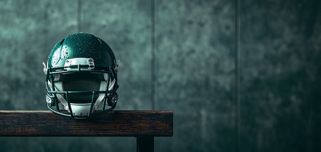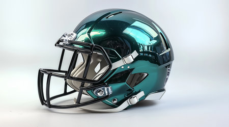 A gleaming football helmet showcased against a dark background, capturing attention with its sleek design and modern appeal. Perfect for sports themes.
