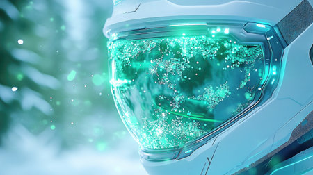 Futuristic sci-fi helmet with digital interface in snowy environment.