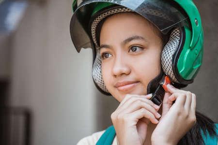 closeup beautiful young girl standing wearing tshirt bag and helmet