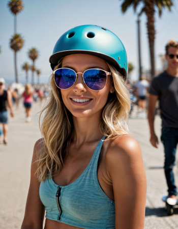 photo of beautiful woman with sunglasses and helmet at sand beach city street, generative AI