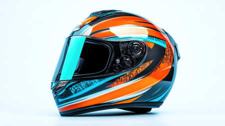 futuristic motorcycle helmet with glowing neon lights. The helmet is isolated on a black background. Generative AI