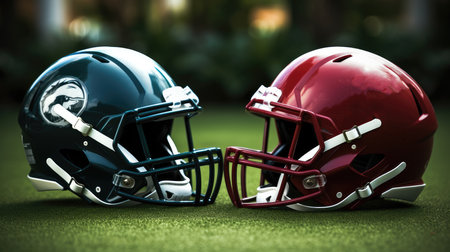A red and dark green football helmet facing each other, Signifying a versus match on a football field.