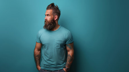 Overweight bearded man with stylish haircut and tattoos in a tight shirt posing confidently against a light blue background.