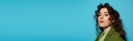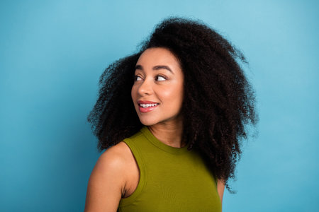 Portrait of a young woman with curly hair wearing a green top against a blue background, looking up confidently